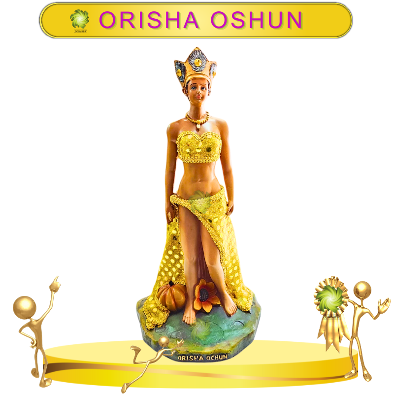 Oshún, la diosa de la fertilidad, el amor y la prosperidad, ofrece sus bendiciones a quienes buscan paz, armonía y éxito en sus vidas. Esta figura dorada simboliza su energía radiante, abundancia y su poder transformador.