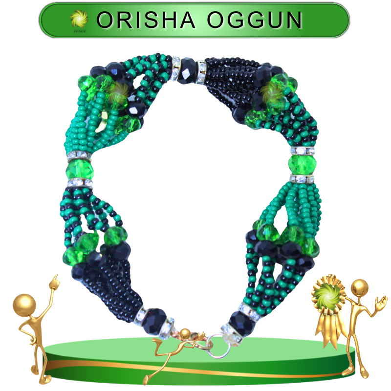 Materiales: Cuentas de colores asociados a Oggún (verde, negro, plata).