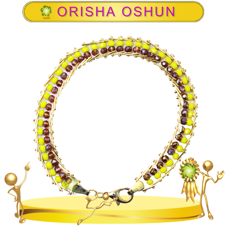 Oshún, la madre de los ríos y fuente de vida, otorga bendiciones de amor, riqueza y equilibrio. Esta pulsera con laminado de oro refleja la luz y la gracia de la diosa, sirviendo como un amuleto para atraer la prosperidad y la felicidad a la vida del portador.