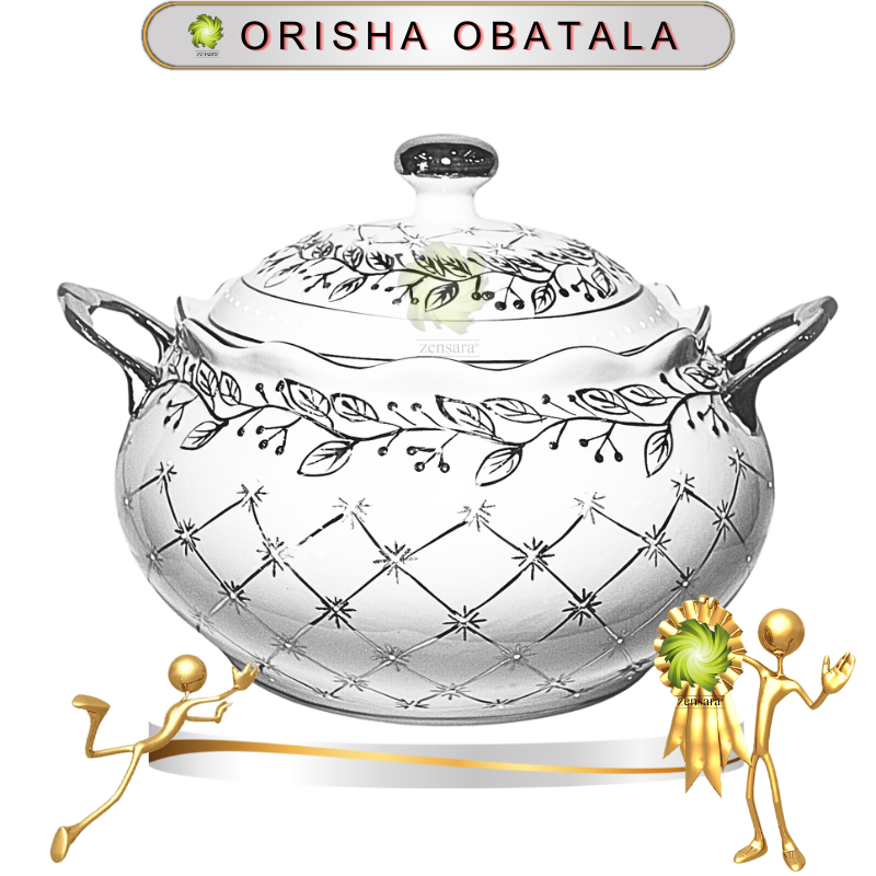Esta sopera representa el trono de Obatalá, un lugar sagrado donde se deposita su poder y presencia en la vida de sus devotos. Su forma circular simboliza la unidad, la perfección y la energía sin principio ni fin, reflejando el carácter sereno y justo de este Orisha.